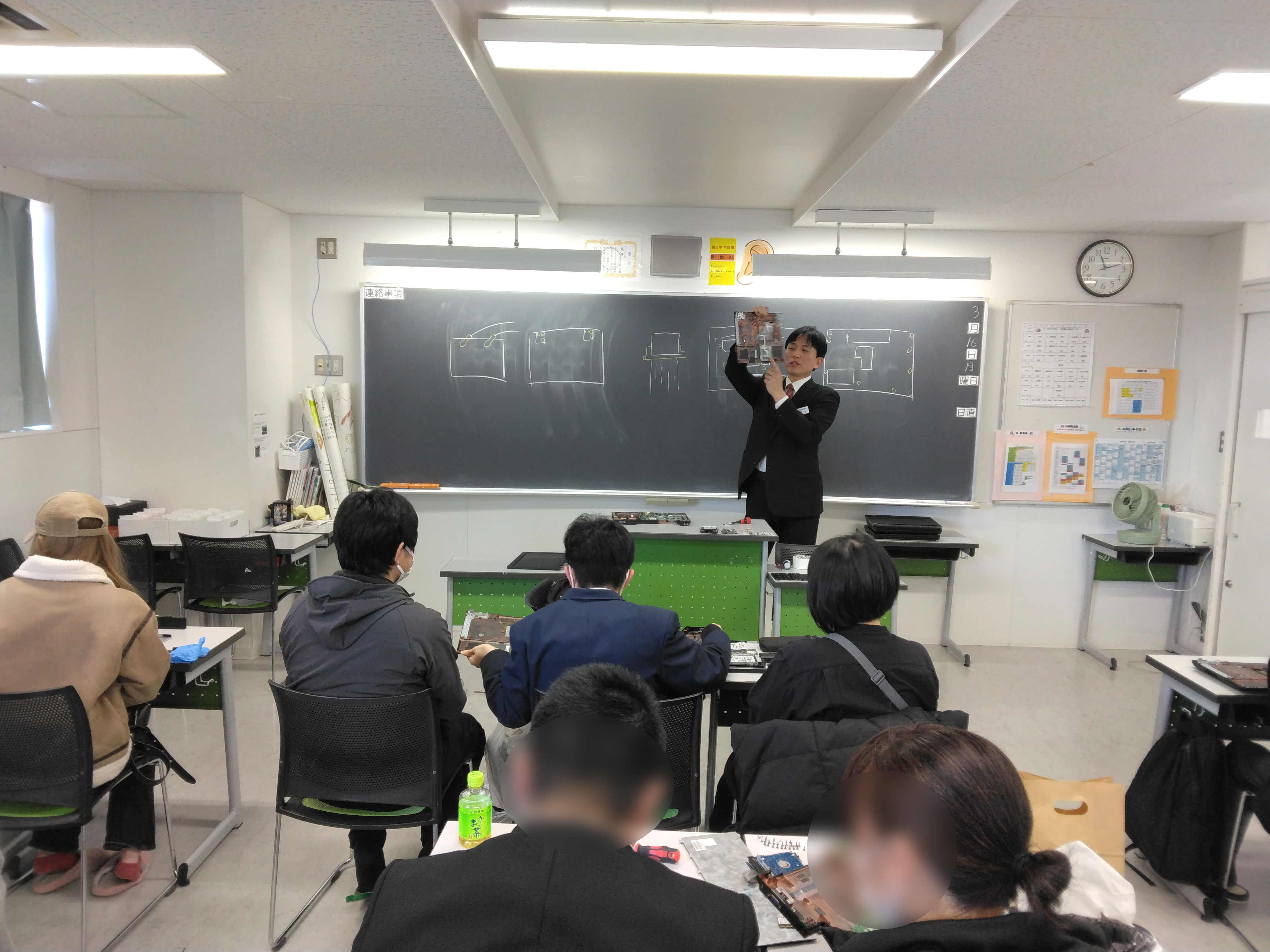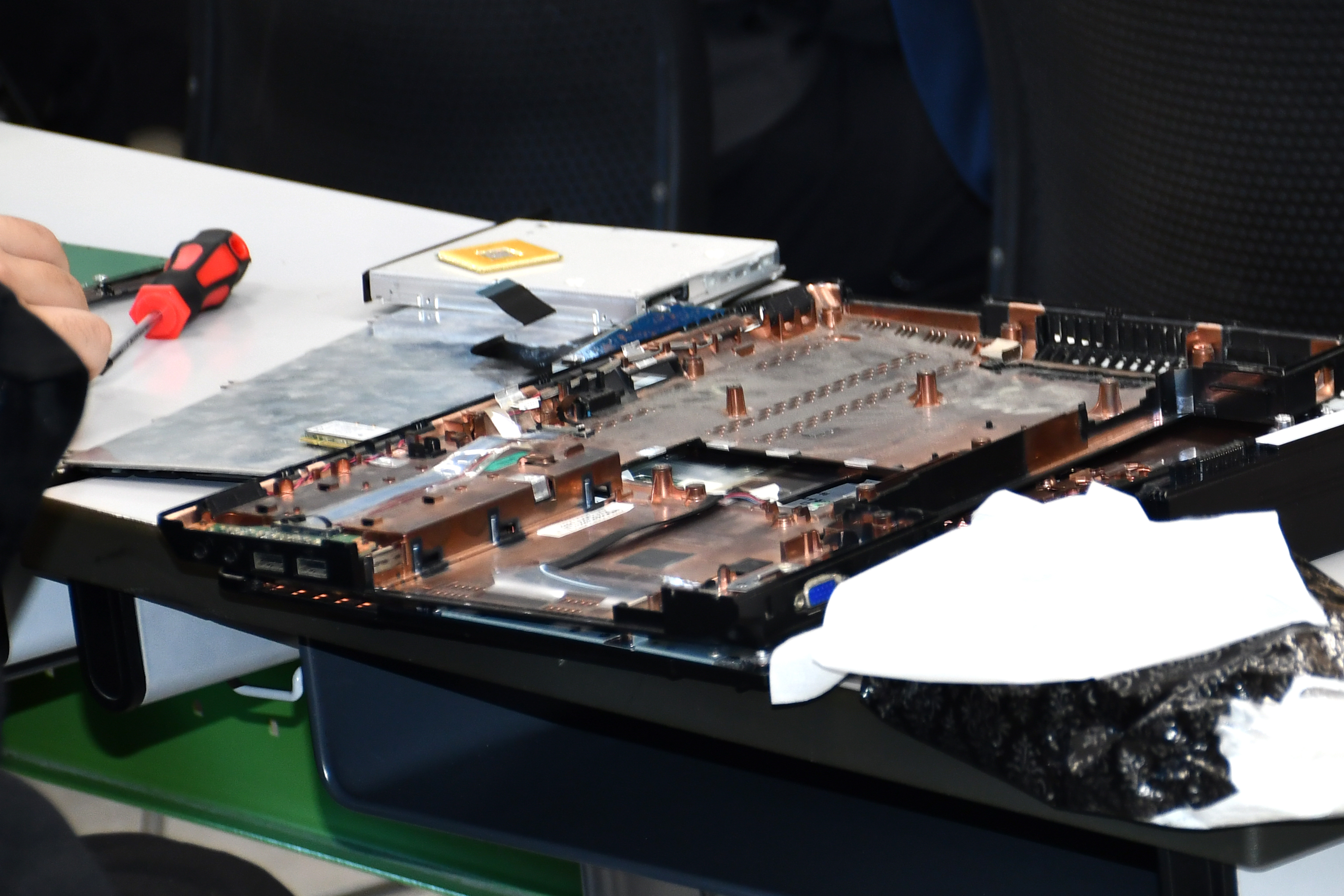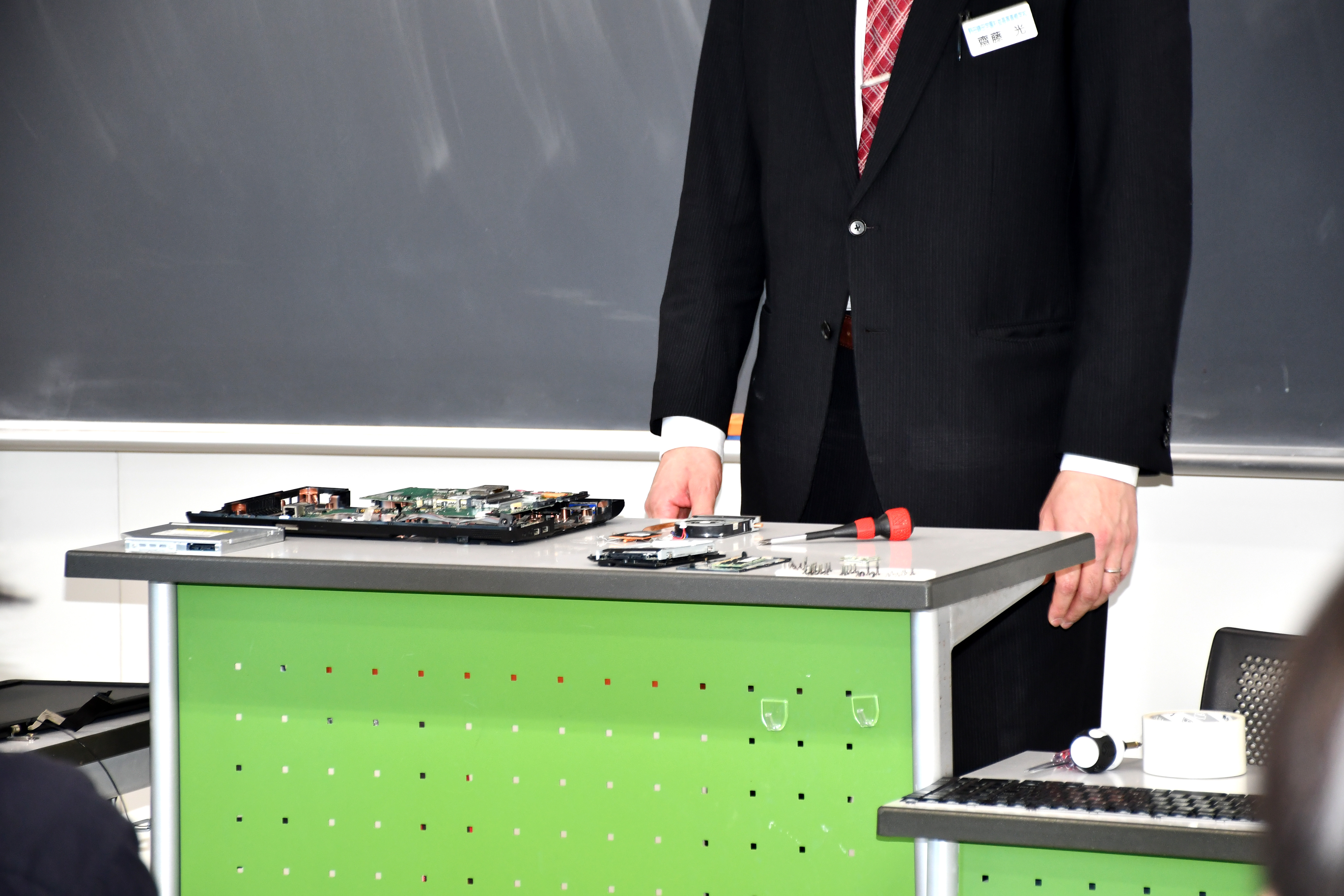 ノートパソコンを解体し、パーツを手に取って観察したり、