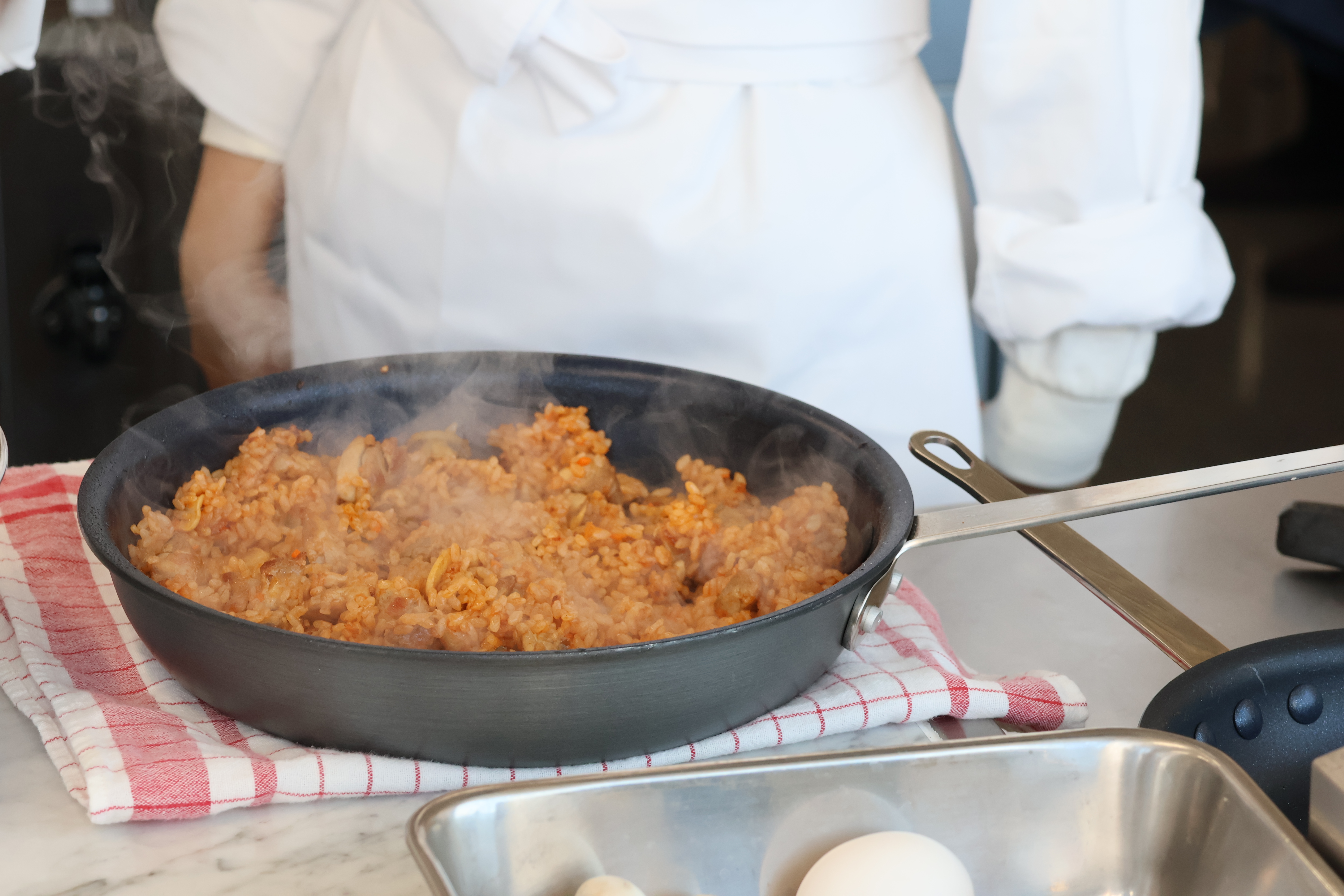 バターライスに鶏肉やマッシュルーム、タマネギ、ハムを加えて