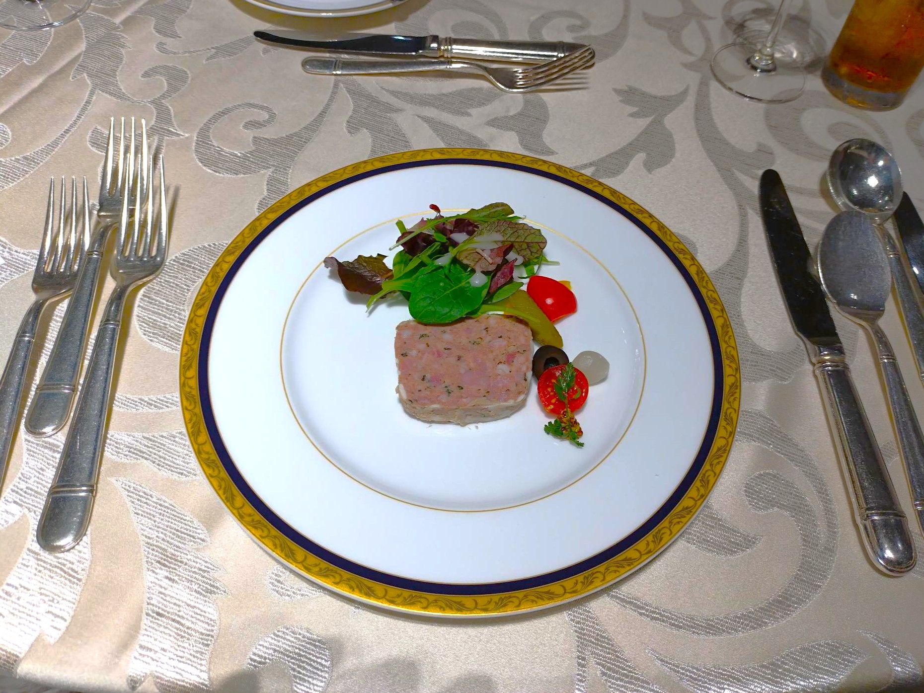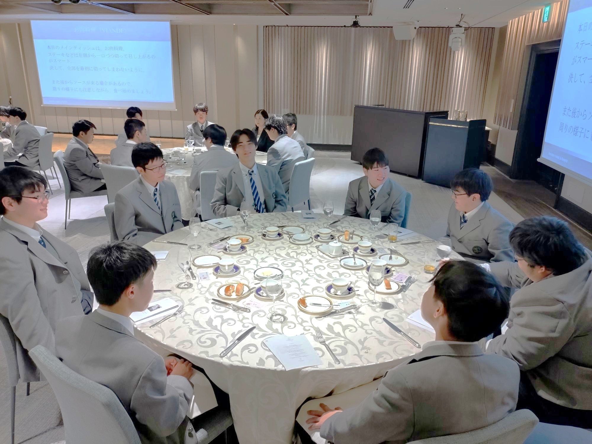 料理長のご挨拶の後、西洋料理のコースを味わいながら、ホテルの講師の方よりナイフやフォークの使い方など、基本的なテーブルマナーについて指導を受けました。
