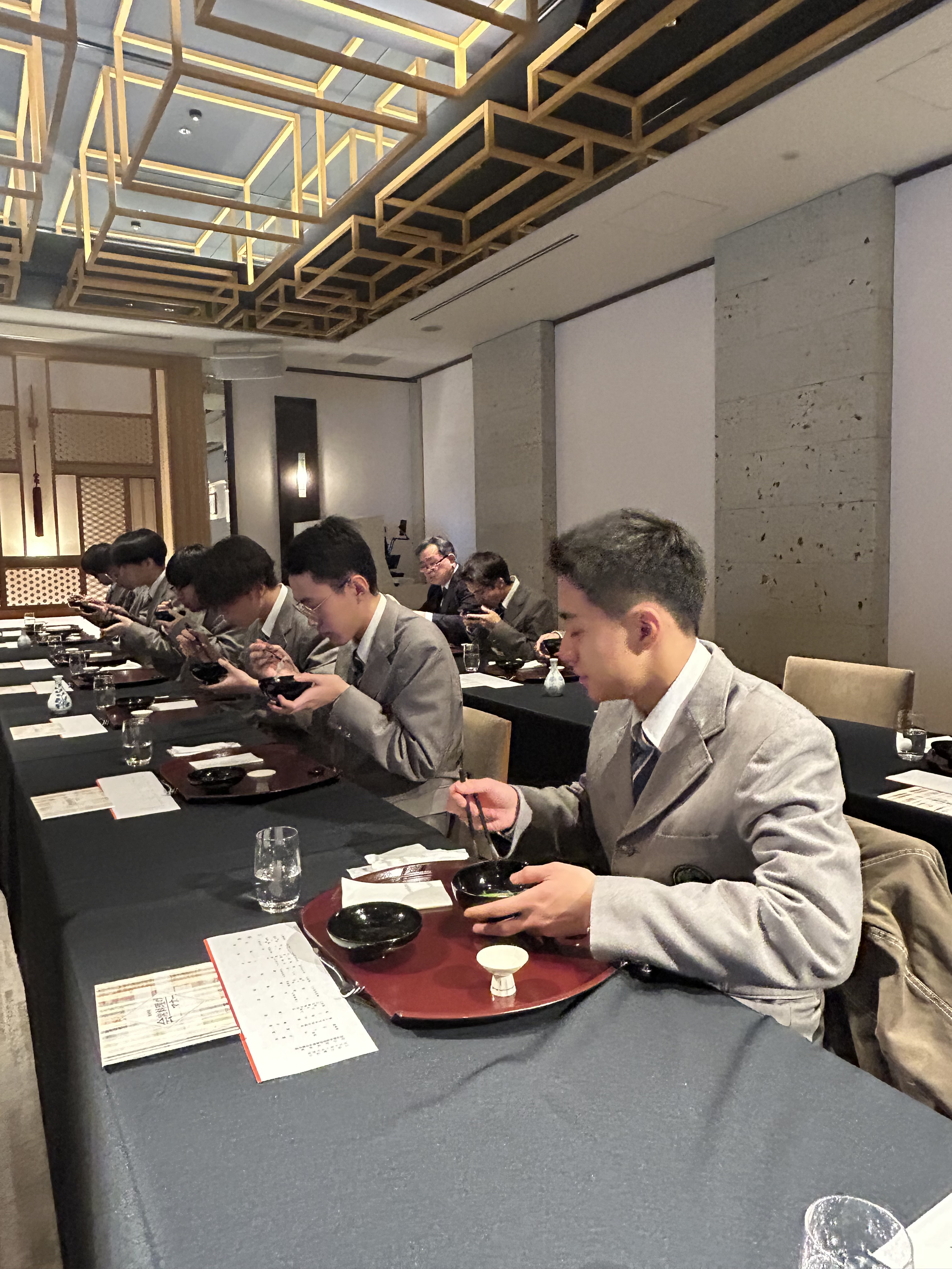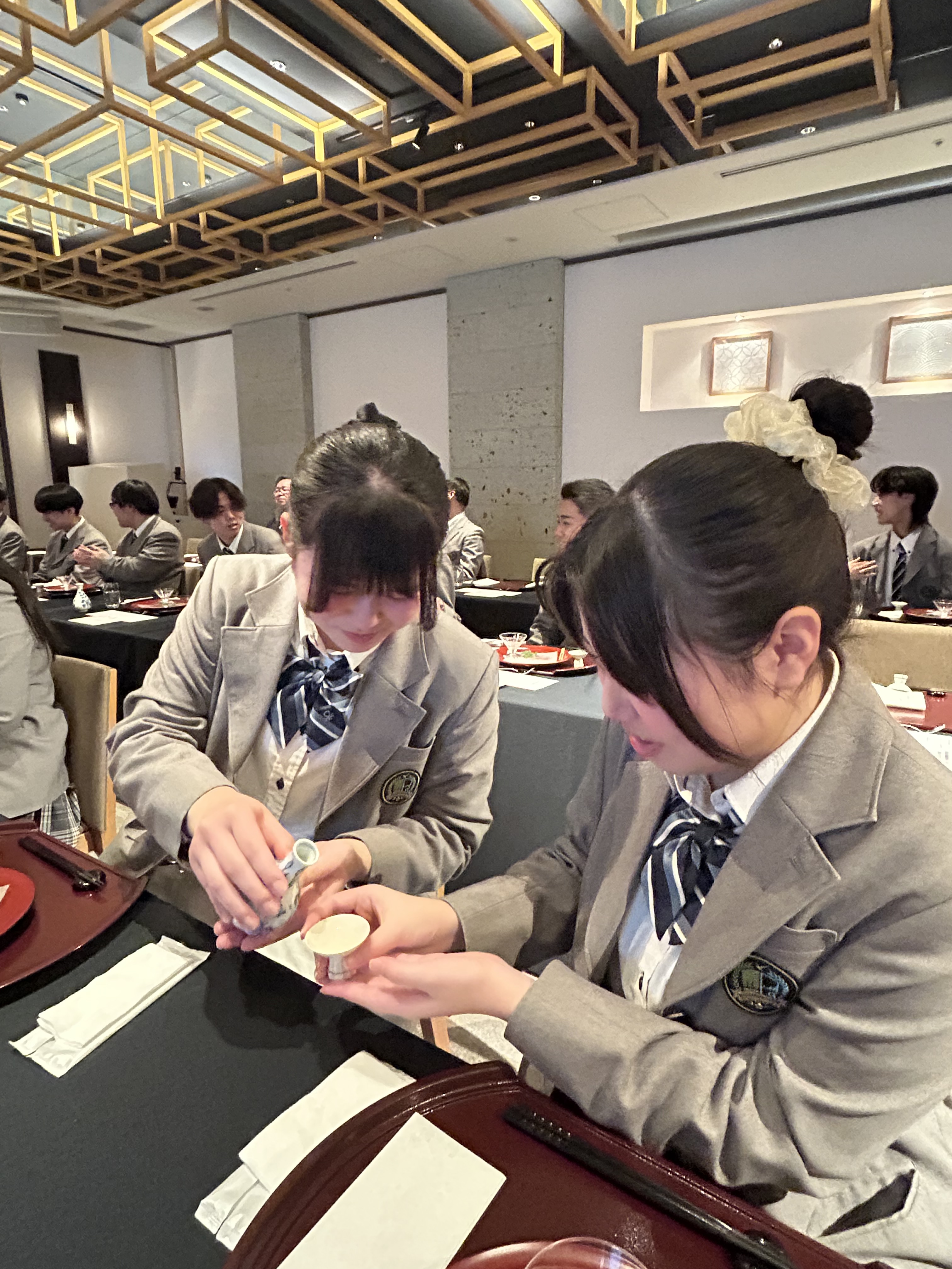 会席料理を味わいながら、箸の扱い方や器の扱い方など、和食の作法について細やかな指導を受けました。また、お酒の注ぎ方や受け方についても学び、社会生活における基本的なマナーへの理解を深めました。(徳利の中身は白湯です)