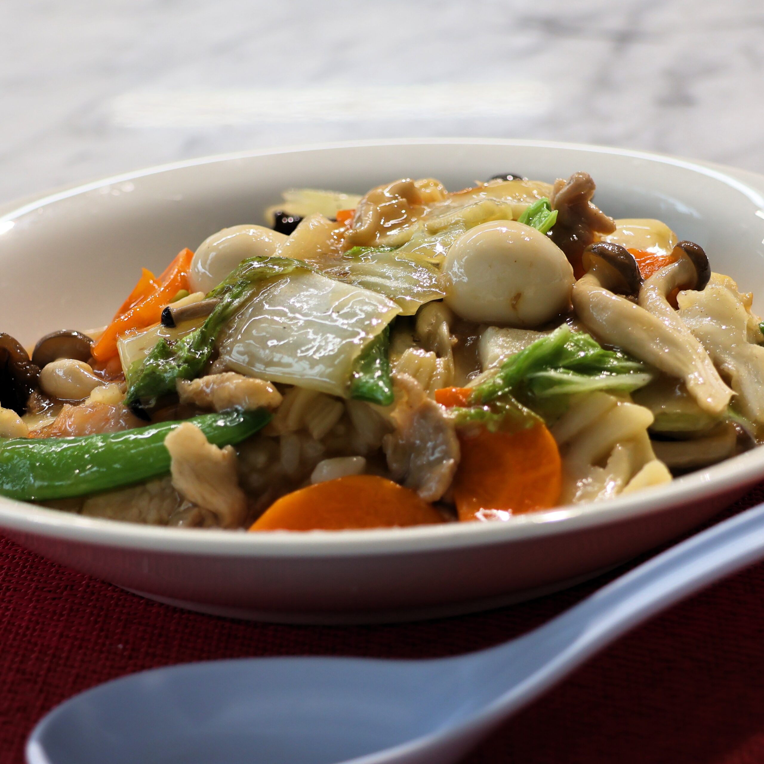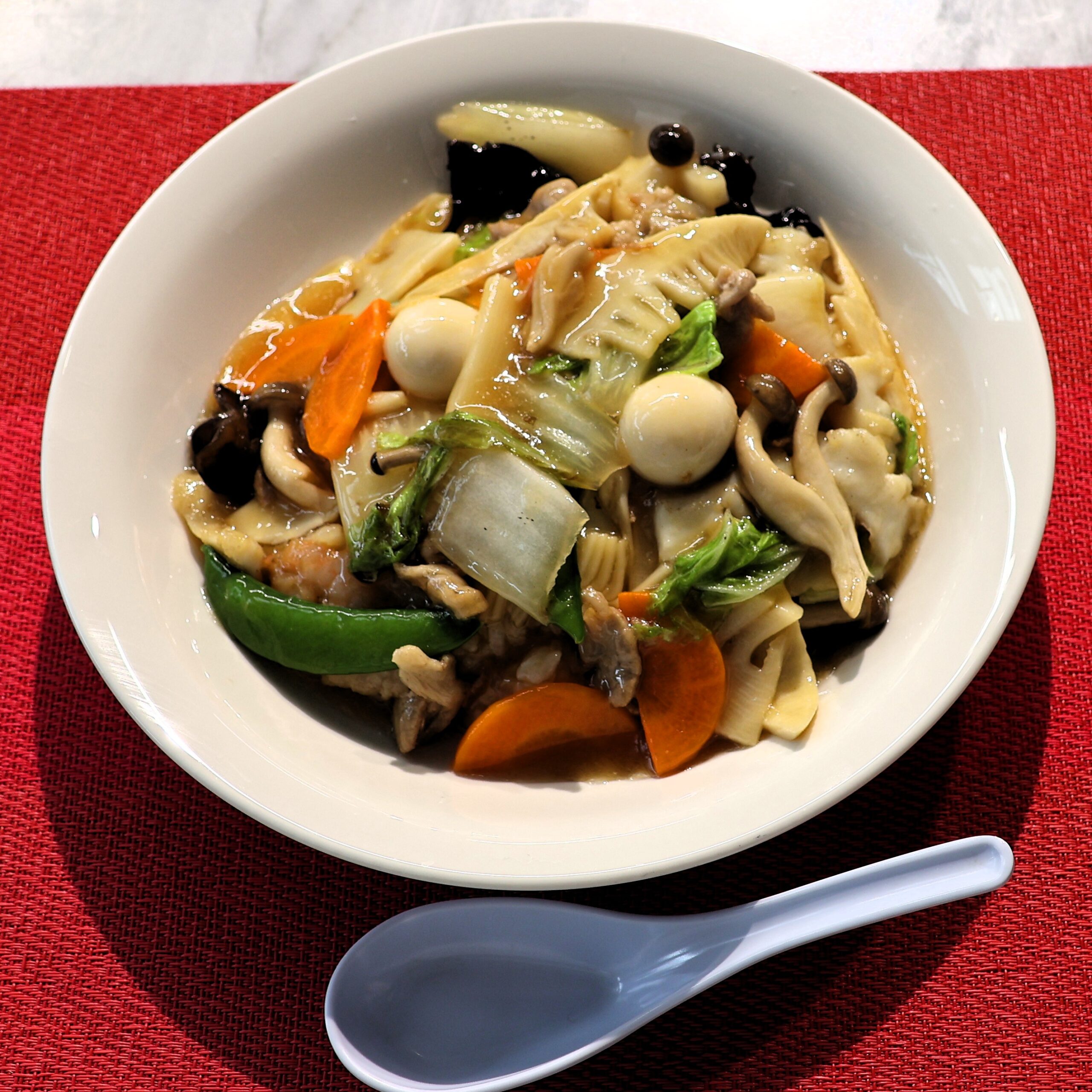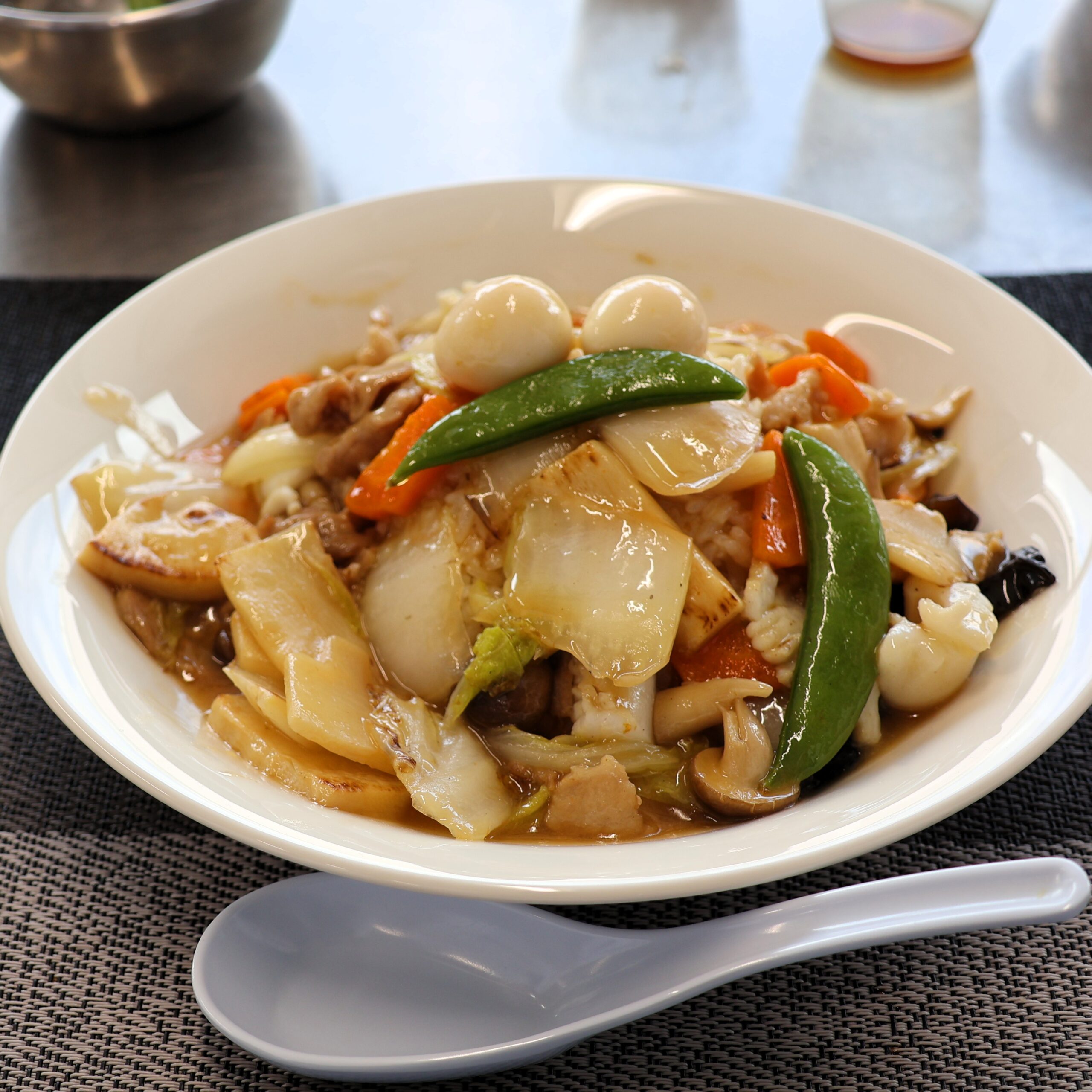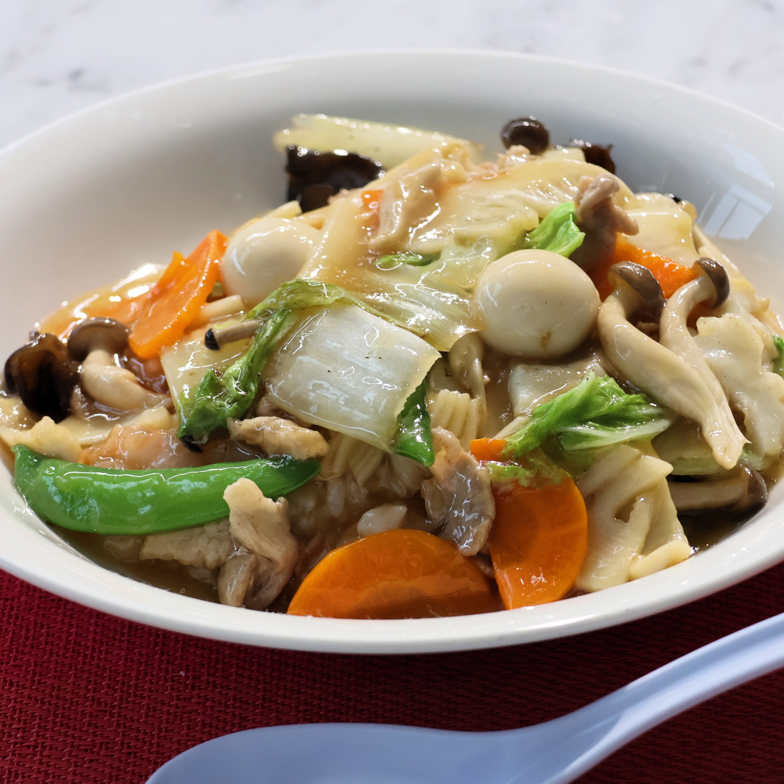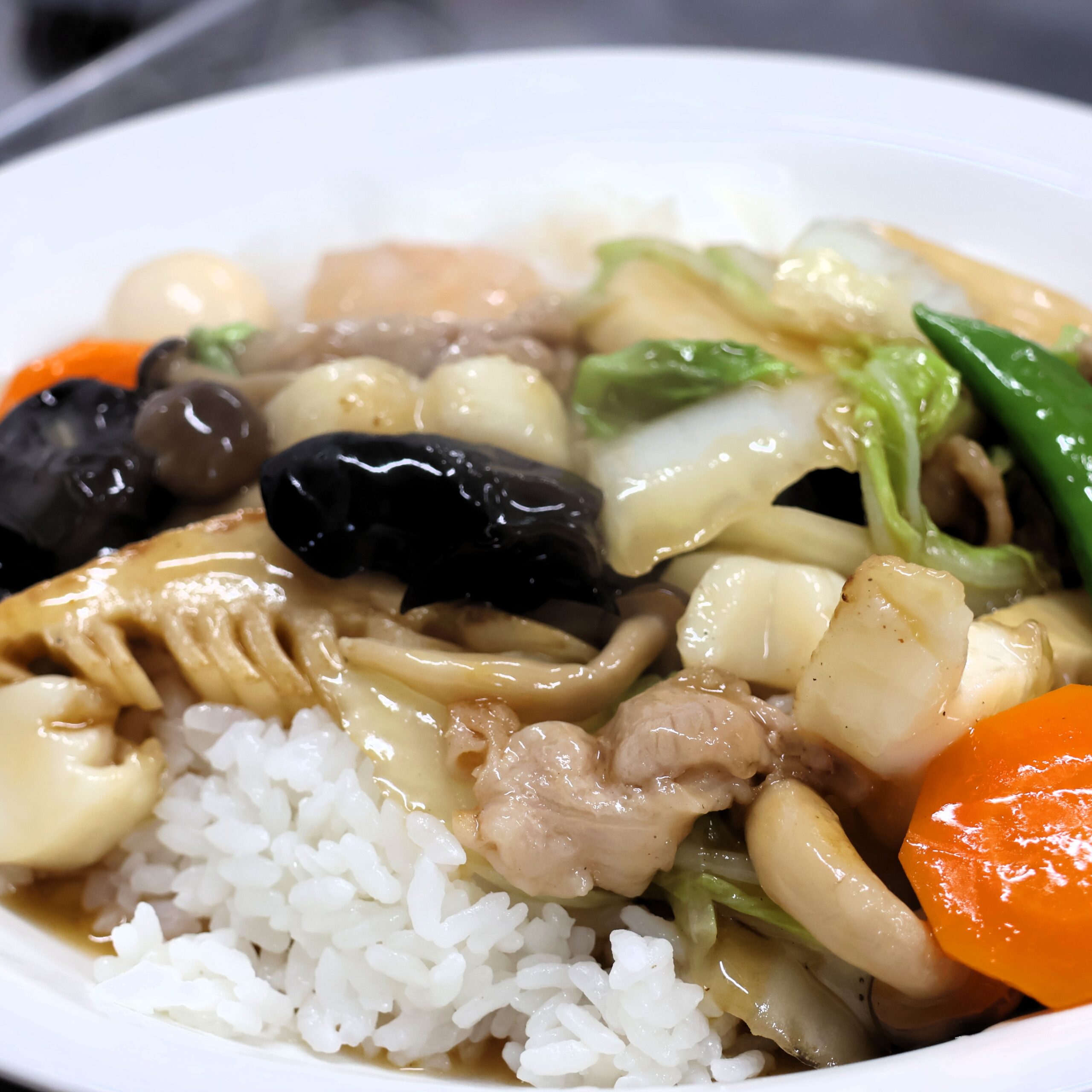 五目あんかけのとろみでイカ、エビ、豚肉、野菜のうま味を閉じ込めて…
