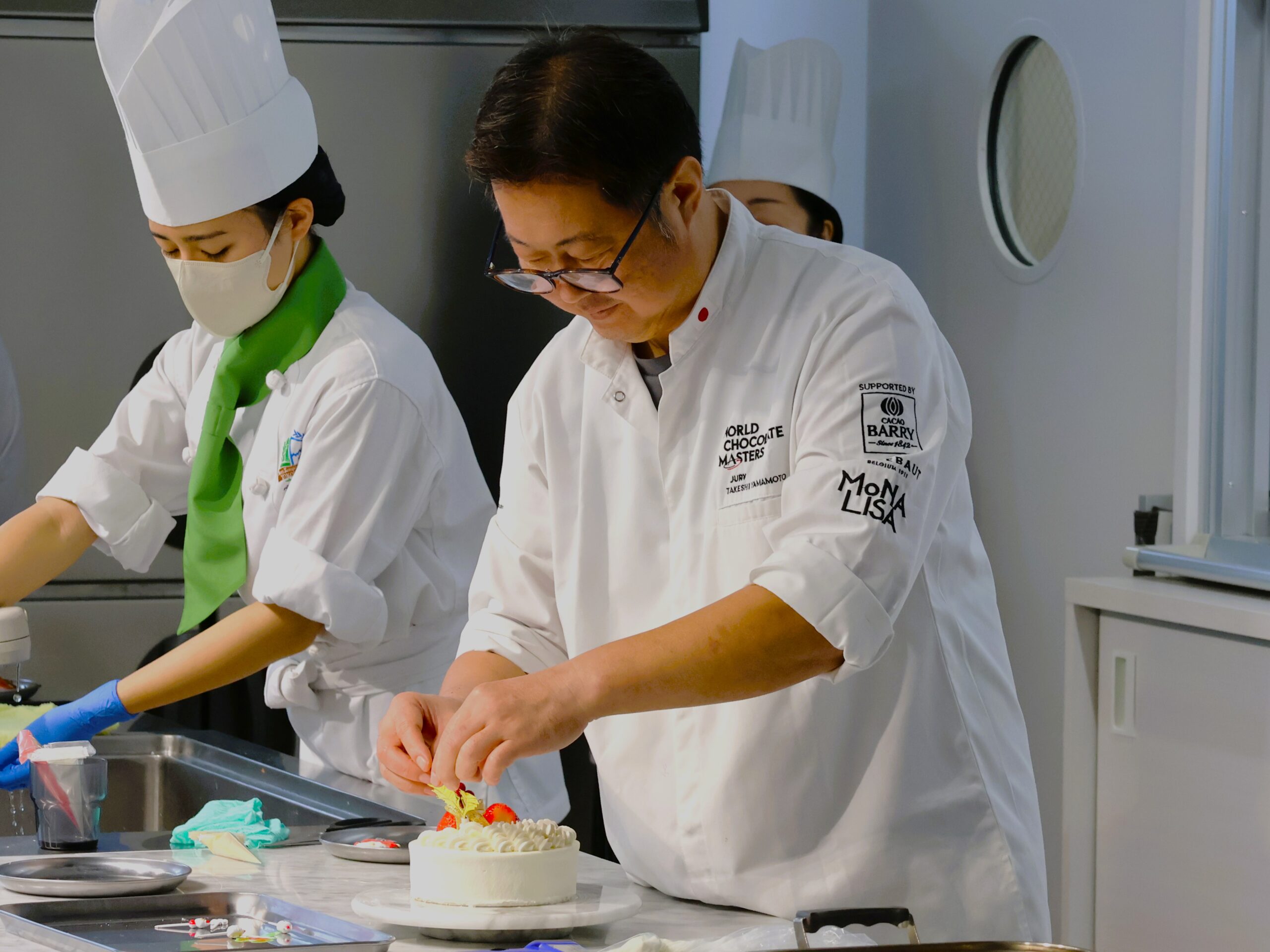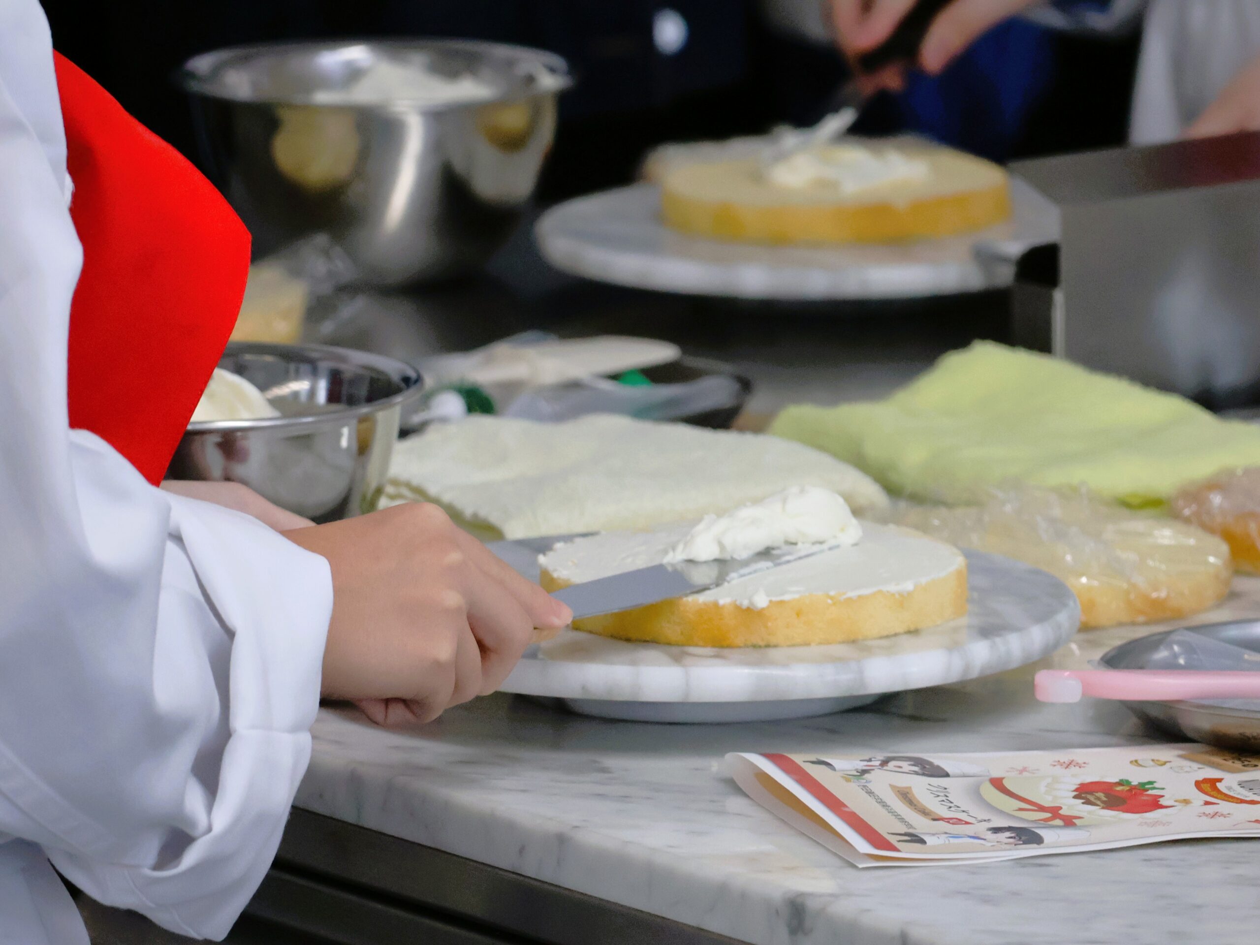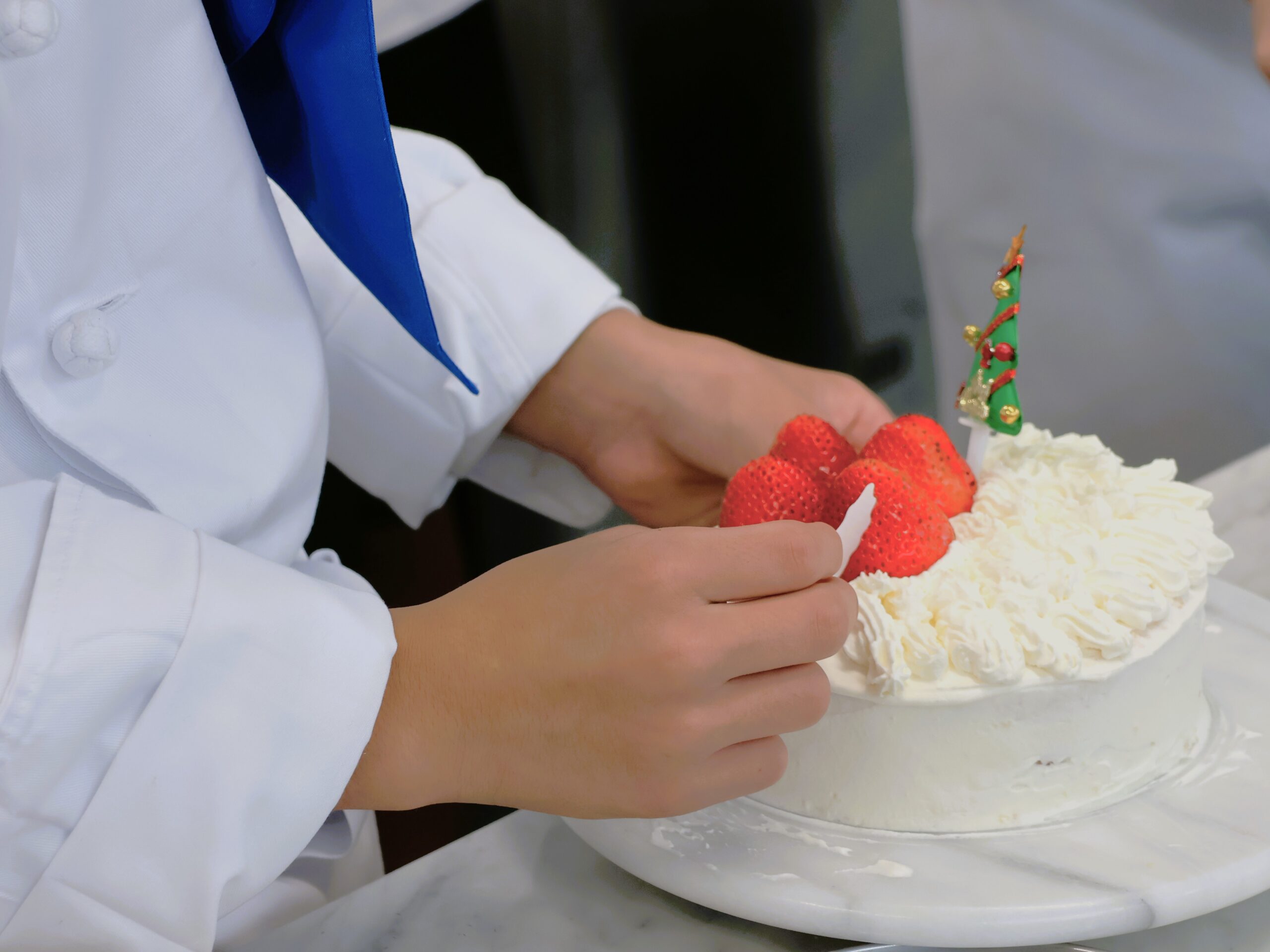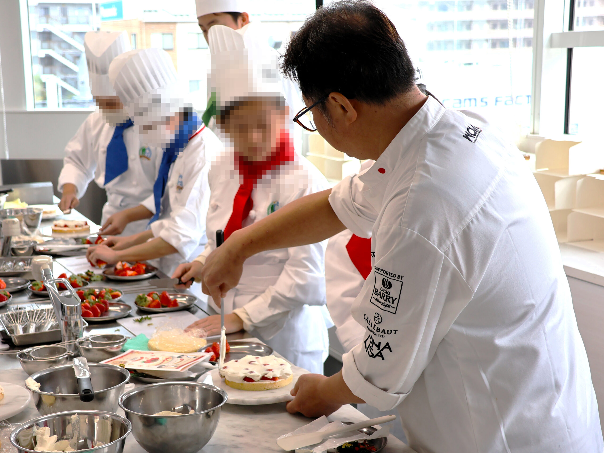 「クリームの泡立て」「デコレーション」など、皆さん真剣な表情で取り組んでいます。