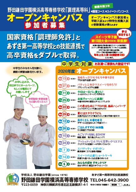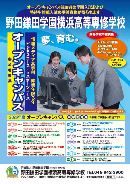 野田横では中学生の皆さんを対象に、2026年度「オープンキャンパス」を6月から開催します。